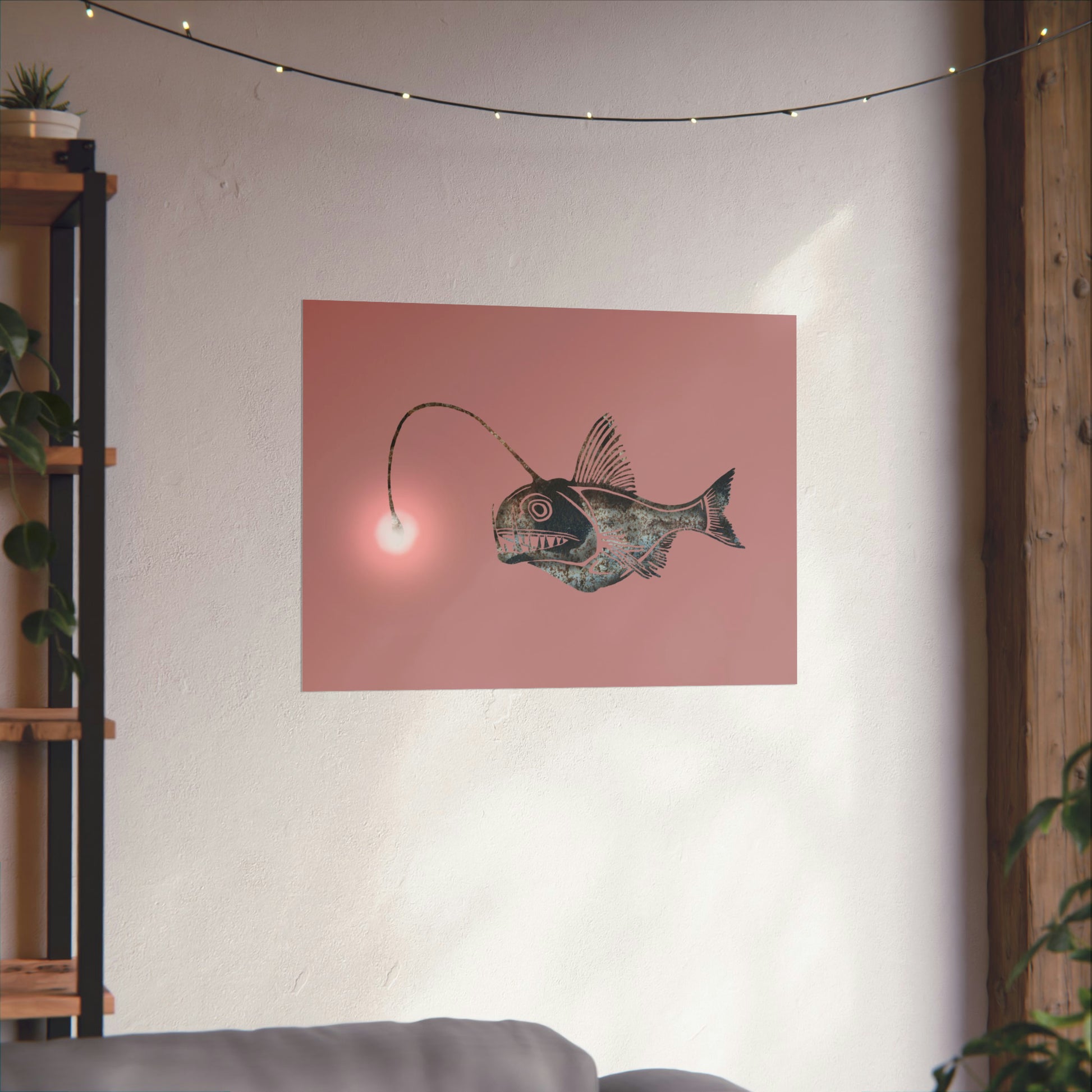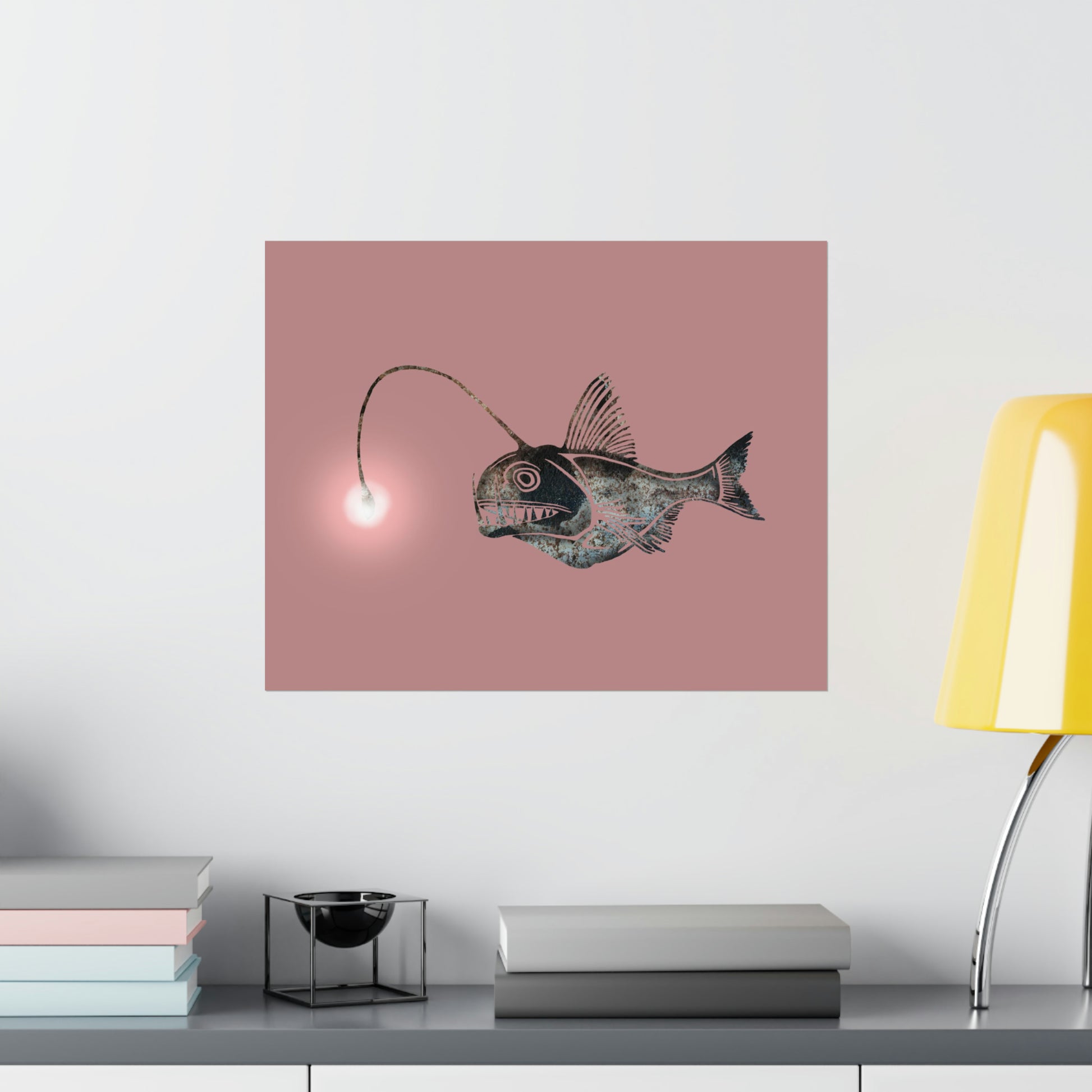 This art piece is a digital drawing of the deep ocean Lantern Fish that features a photo of a rusty train car in Ithaca, NY. This unique piece of art is perfect for nature-lovers who want to spruce up their home décor with a beautiful representation of the marine world.